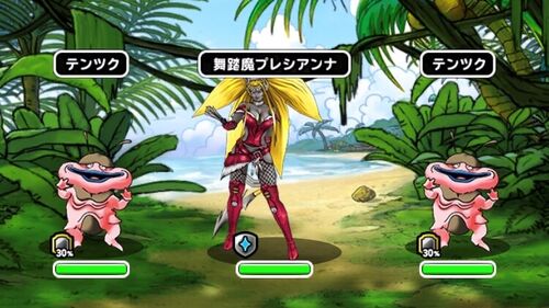 みんなで冒険、密林の財宝島を攻略します! 特別条件がかかっているので、魔獣系でギラやバギの攻撃力依存特技を持つモンスターが最適です。 オススメはヘルゴラゴ1体、ノーブルニャイト4体の構成です。