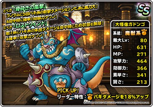友と駆ける騎士のイベントでは、大怪像ガドンゴを仲間にすることができます! 忘れられた霊廟でギリメカラのカギを集めて、30本で1体ギリメカラを仲間にして、それを転生させることで大怪像ガドンゴになります。 ということは、☆4+4を1体作るのにカギが30本×…